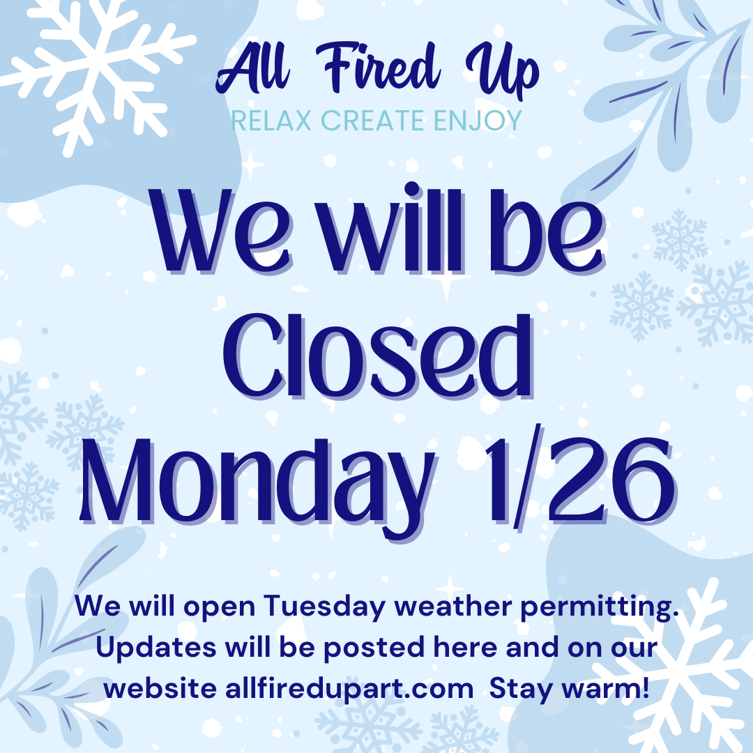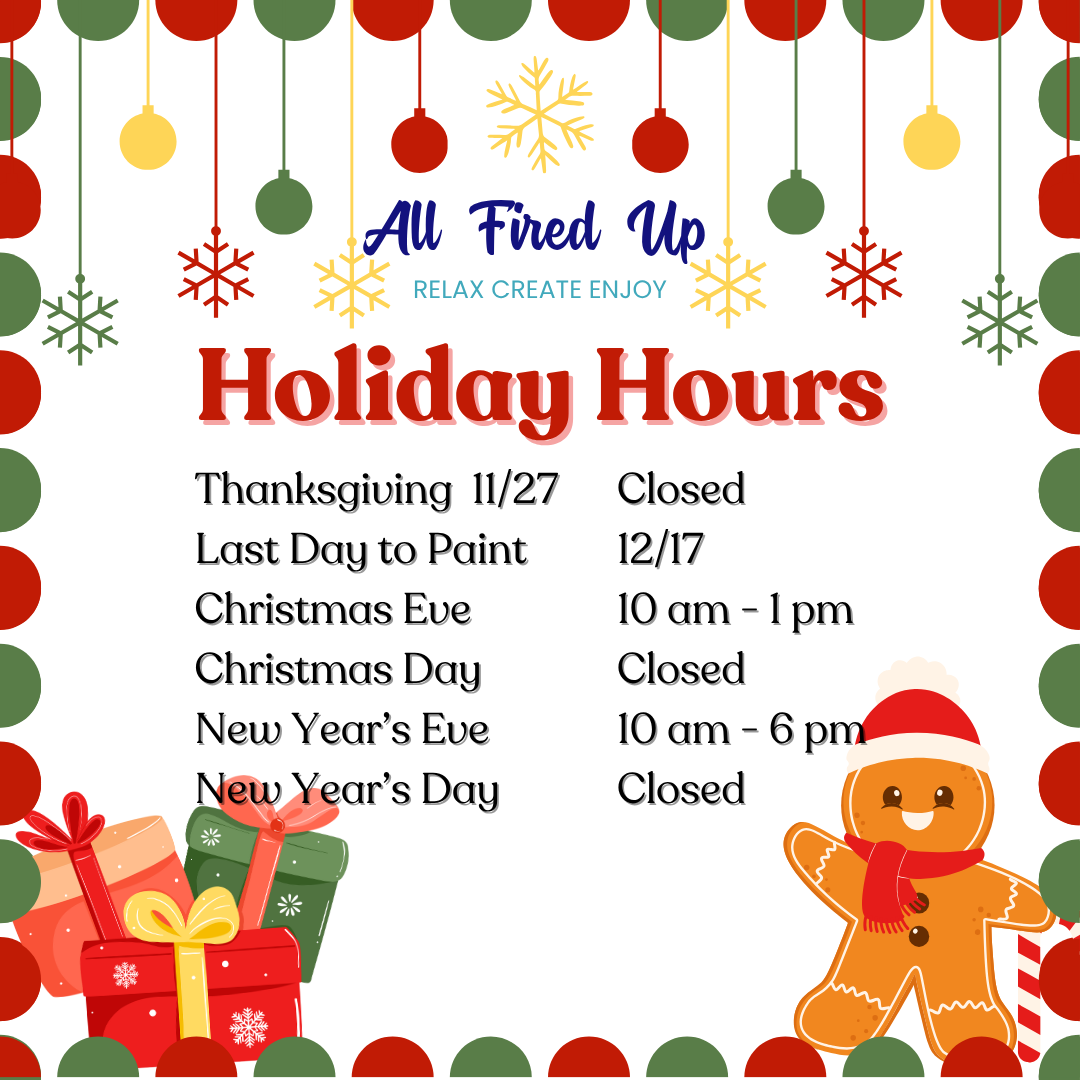 To ensure your painting experience is enjoyable, we kindly request that you make a reservation, particularly for weekends and holidays when we tend to be very busy. We will do our best to accommodate walk-in guests if we have space available. If you don't have a reservation, we highly recommend calling ahead to check if we have room for you. If we are unable to seat you immediately, we will gladly add you to our waitlist. Thank you for your understanding and we look forward to having you create with us.